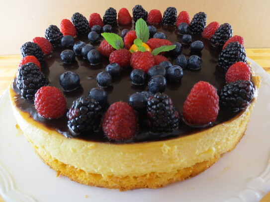 Cratiţa se pune în tavă pregătită cu apă şi se coace în cuptor timp de 50- 55 de minute. În timpul coacerii, blatul se va ridica singur deasupra cremei iar fructele vor sta la mijloc între cremă şi blat. După trecerea acestui timp, se scoate tortul din cuptor şi se verifică dacă crema e bine închegată, încercând să o desprindem de pe pereţii cratiţei. Când nu e gata, se poate observa lichid alb la bază. În acest caz se pune din nou la cuptor şi se încearcă din nou după 5-10 minute. Normal, ar trebui să fie gata după 50 minute, dar depinde mult de cuptor.