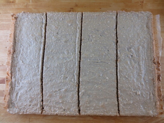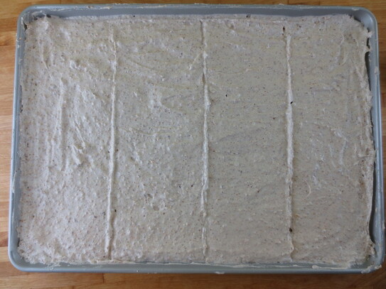 După ce foaia s-a scos din cuptor, se lasă să se răcească puţin (aprox 5 minute), apoi se scoate din tavă şi se taie pe liniile marcate dinainte de coacere. Se obţin 4 foi egale, în formă dreptunghiulară, care se vor folosi la asamblarea prăjiturii.