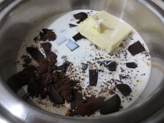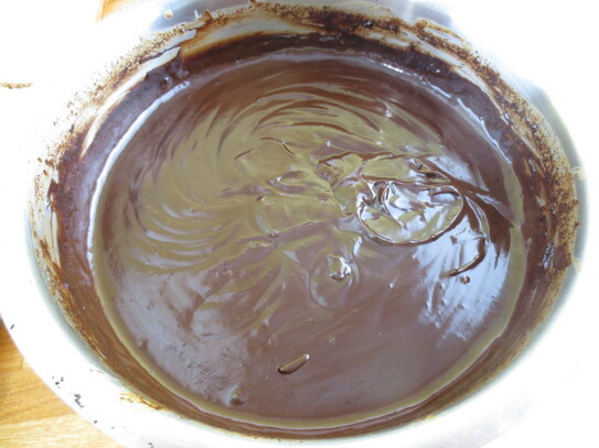 Ciocolata amăruie se rupe în bucăţi mai mici, se adaugă frişca lichidă, untul şi o linguriţă de ness, după care se transferă totul pe baia de abur, amestecându-se continuu până când ciocolata se topeşte şi amestecul se omogenizează. Se ia de pe aburi, iar când crema s-a răcit, se împarte în două părţi egale, pentru umplut foile.