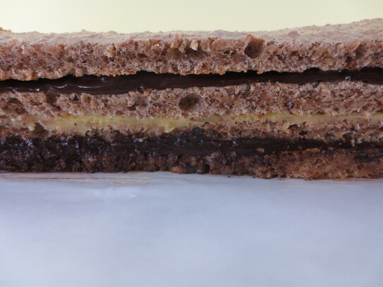 Pe prima foaie se întinde jumătate din crema de ciocolată. Se pune apoi ce-a de-a doua foaie şi se întinde o treime din crema de unt. Se pune cea de-a treia foaie, după care se întinde a doua jumătate din crema de ciocolată, după care se aşează ultima foaie.