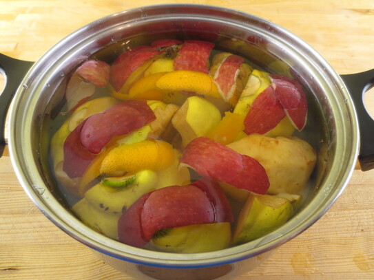 Într-o oală mică se face un sirop din apă şi zahăr care se aduce la fierbere. Se adaugă gutuile, cojile de măr şi portocală. Se aduce la fierbere la foc mediu, şi apoi se reduce la foc mic şi se fierbe câteva minute, astfel încât feliile să devină flexibile dar ferme. Dacă se lasă prea mult la fiert, acestea se vor zdrobi.