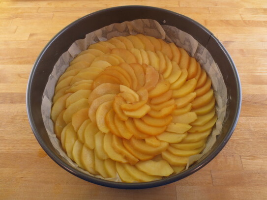 Feliile de gutui se scot de la frigider,se scurg de suc şi se aranjează în tavă în cercuri concentrice. Feliile se suprapun uşor una peste cealaltă, continuându-se, până când toată baza tăvii este acoperită. Se toarnă apoi 1/2 cană din siropul în care au fiert gutuile şi se lasă deoparte.
