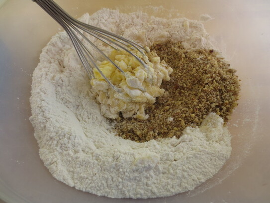 Pentru prepararea blatului, se cerne mai întâi făina într-un castron de mărime potrivită, apoi se adaugă praful de copt, sare, coaja rasă de lămâie şi vanilia şi se amestecă ingredientele. Se adaugă nucile măcinate şi se amestecă în continuare până când se omogenizează.