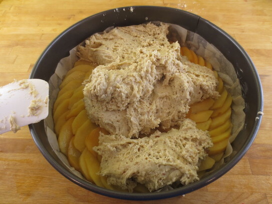 Aluatul se toarnă peste gutuile din tavă şi se întinde uniform cu o lingură de lemn sau o spatulă.