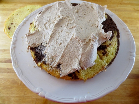 Se obţine o compoziţie omogenă din care se toarnă cam două treimi într-o tavă rotundă de tort, unsă cu grăsime şi tapetată bine cu făină. În treimea de compoziţie rămasă adăugăm o lingură de cacao cernută şi restul de spumă de albuş rămasă. Se amestecă uşor, apoi se toarnă în formă de tort, peste compoziţia de culoare galbenă. Acest strat de cacao va fi folosit ca bază la asamblarea tortului.