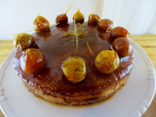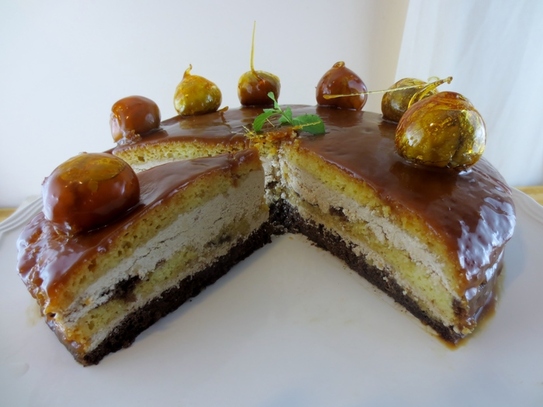 Se prepară apoi glazura de caramel. Se caramelizează o cană de zahăr, iar când culoarea sa devine aurie, se adaugă frişcă lichidă, amestecându-se în continuare până când siropul se îngroaşă bine. Se lasă să se răcească. Când glazura devine călduţă şi este încă fluidă, îmbrăcaţi tortul cu glazură pe deasupra şi lateral. Se ornează pe deasupra cu castanele îmbrăcate în zahăr ars.