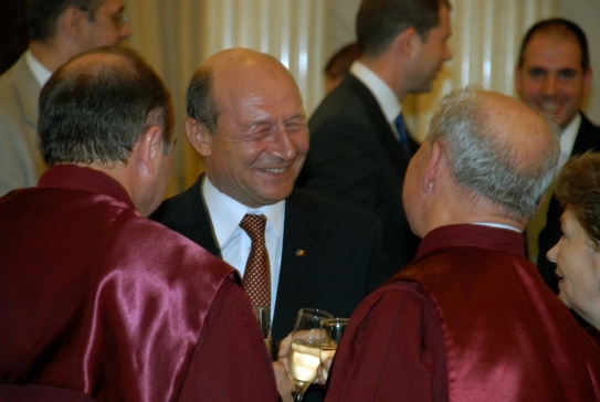 După discurs, şeful statului i-a invitat pe judecătorii Curţii Constituţionale să ciocnească un pahar de şampanie, remarcând că: "Pentru ca plenul Curţii Constituţionale nu e atât de mare ca al Guvernului, vă invit la un pahar de şampanie".