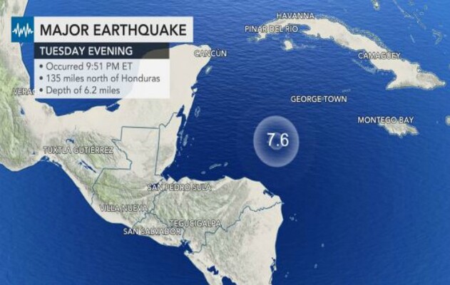 Cutremurul, care afectează în principal ţările din America Centrală, în special Honduras, a fost înregistrat la ora 20:50 (ora locală). Epicentrul se află la aproximativ 200 kilometri nord de Barrapatuca, în nord-vestul ţării, şi la 36 kilometri de Insulele Swan.