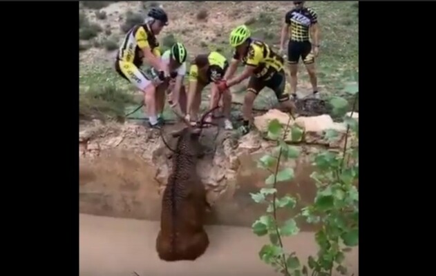 Un grup de biciclişti spanioli salvează un cerb blocat de inundaţii [video]
