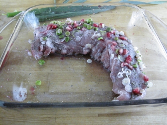 Se începe mai întâi cu marinarea cărnii. Se spală carnea şi se usucă, după care se condimentează cu sare şi piper. Se asează carnea într-o tavă termorezistentă, se adaugă măgheran sau cimbru uscat, usturoiul mărunţit, şi câteva seminţe de rodii zdrobite. Apoi, se toarnă peste carne 2-3 linguri de oţet balsamic. Carnea se lasă la macerat pentru câteva ore.