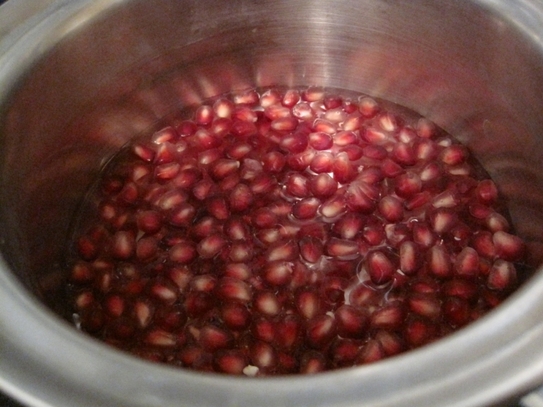 Între timp se pregăteşte sosul de rodie. Se scot boabele din rodie , se pun într-o cratiţă mică, după care se toarnă apă astfel încât să fie acoperite. Se pune cratiţa pe sobă la foc mare, amestecând din când în când, până când apa să înceapă să fiarbă. Nu uitaţi să puneţi deoparte câteva boabe de rodie pentru decorat.