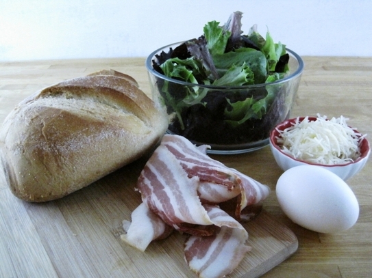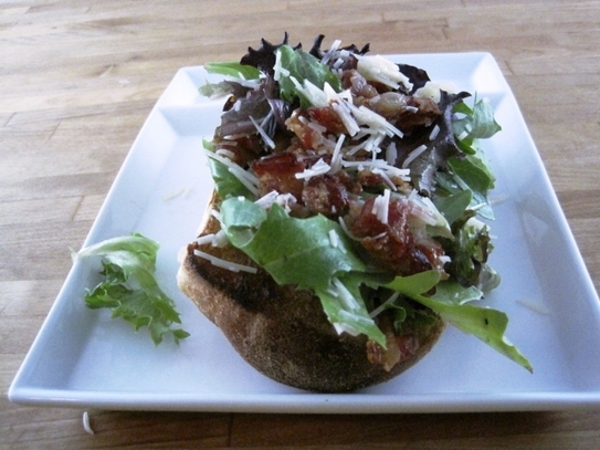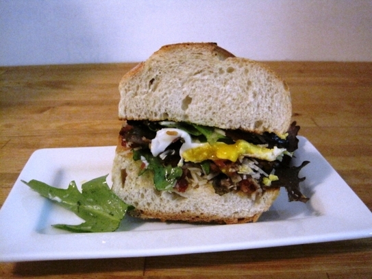 Scoateţi oul din tigaie şi-l puneţi pe partea de sus a chiflei, peste salată şi brânza rasă. Peste ou se pune restul de salată şi cealaltă bucată de chiflă rămasă.