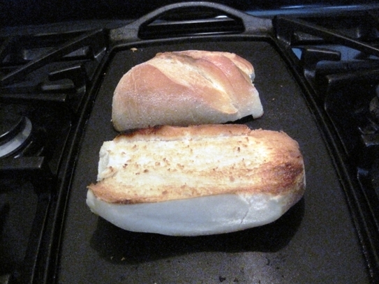 Tăiaţi chifla în jumătate, pe părţile laterale, după care o prăjiţi, fie într-un prăjitor de pâine, fie pe o plită încinsă.