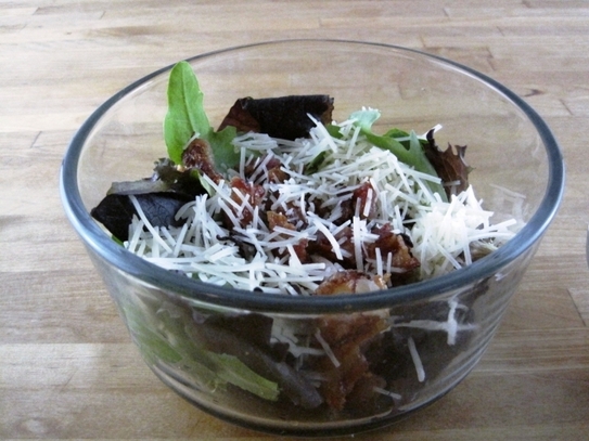 Puneţi salata într-un castron de mărime medie. Tăiaţi şunca/ slănina în bucăţi de 1-2 cm lăţime, pe care apoi o prăjiţi într-o tigaie mică, la foc moderat, până ce grăsimea devine clară. Când e gata, se toarnă imediat peste salată, se adaugă oţetul, muştarul, sare şi piper, amestecându-se uşor.