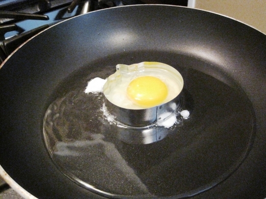 Reîncălziţi tigaia la foc. Adăugaţi uleiul şi lăsaţi să se încingă. Spargeţi un ou în tigaie, presăraţi-l cu sare şi piper, după care reduceţi focul la mediu. Acoperiţi cratiţa cu un capac, pentru a ajuta că oul să se gătească mai repede şi mai uniform. Într-un minut, ar trebui să fie gata.