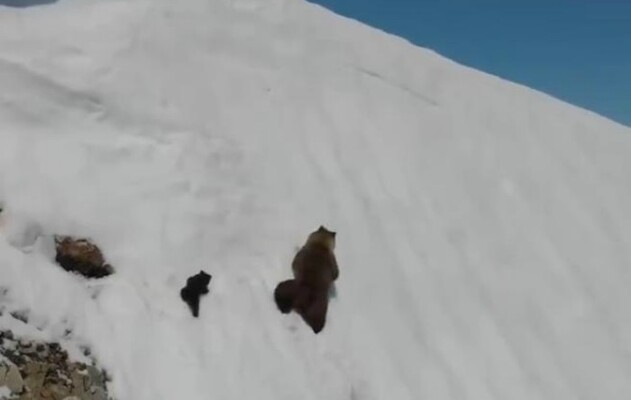 Un ursuleţ face eforturi impresionante să nu se piardă de mama lui în zăpadă [video]
