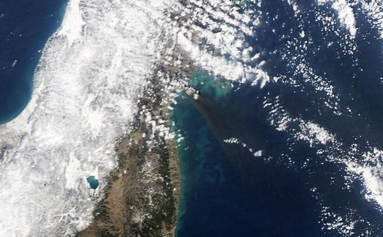 Imagine din spatiu furnizata de NASA, surprinzand norii de fum provocat de valul seismic din Japonia la 12 martie 2011 si tsunami-ul din Oceanul Pacific. (NASA via Getty Images)