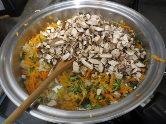 Pentru prepararea umpluturii de ciuperci, se pregătesc mai întâi zarzavaturile. Ceapa sau prazul se curăţă şi se taie mărunt. Morcovii se curăţă şi se rad pe răzătoarea mare. Ţelina se curăţă şi se dă pe răzătoarea mică. Ciupercile bine şterse de impurităţi cu un prosop de bucătărie, se toacă mărunt.