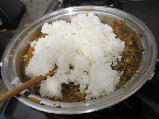 Orezul se fierbe separat într-o oală, în care s-a adăugat o cană şi jumătate de apă fierbinte şi un praf de sare. Se fierbe aproximativ 10 minute, apoi se lasă deoparte. Orezul va absorbi toată apa.