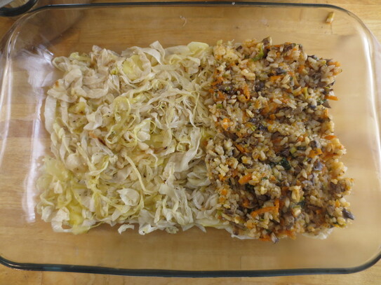 Urmează asamblarea în straturi, alternând câte un strat de varză şi unul de umplutură. Într-un vas termorezistent se toarnă puţin ulei, atât cât să se ungă bine vasul pe interior, apoi se adaugă un strat de varză, după care se întinde un strat de ciuperci, urmând un alt strat de varză şi din nou ciuperci. La final se acoperă cu varză rămasă. Deasupra se pun rondele de roşii, peste care se toarnă în fir subţire ulei de măsline.