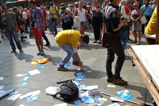 A urmat reacţia plină de solidaritate a trecătorilor faţă de practicanţii Falun Gong: turiştii străini şi italieni au cules materialele de pe jos şi au încercat să calmeze cei doi bărbaţi chinezi.