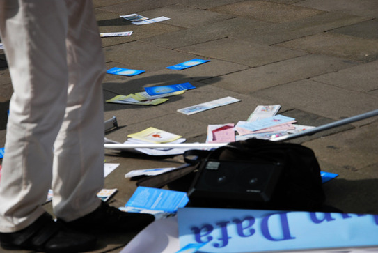 În jurul orei 13:30, doi chinezi având vârsta în jur de 30 de ani s-au apropiat de locul informării, protestând vehement împotriva practicanţilor Falun Gong şi deteriorând materialul informativ expus prin ruperea flyerelor expuse, aruncarea lor pe jos şi călcarea lor în picioare. De asemenea agresorii au tras de bannerele afişate şi au deteriorat structura de aluminiu a bannerului roll-up.