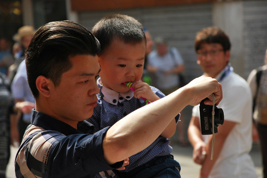 Unul dintre cei doi agresori ţinea în braţe un copil în vârstă de circa 2 ani. El s-a apropiat iniţial de un practicant Falun Gong, care a încercat să îi ofere câteva informaţii. Dar reacţia chinezului a fost o criză de furie. Efortul practicanţilor şi al trecătorilor de a-l calma s-a dovedit inutil. Agresorul a aruncat pe jos aparatul audio cu muzică Falun Dafa, după care a început sa îl lovească cu picioarele.