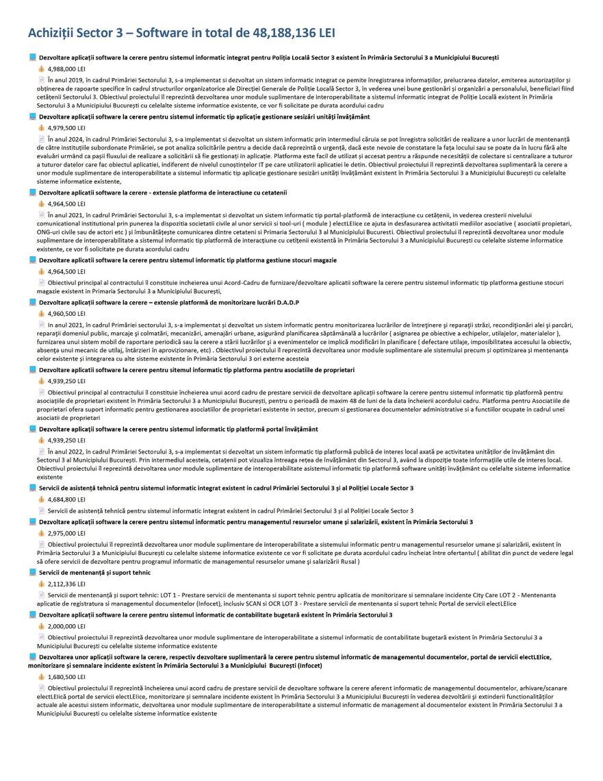 Liderul partidului DREPT a explicat că este vorba despre aplicaţia pentru "monitorizarea şantierelor" (cumpărată din 2021), cea pentru "interacţiunea cu unităţile de învăţământ" şi încă aproape 8 aplicaţii cumpărate între 2019 şi 2024.