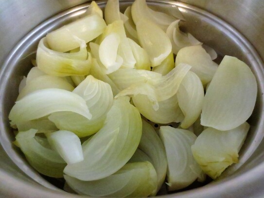 După ce s-a răcit, ceapa se dă prin maşina de tocat folosind sita cu găuri mici.