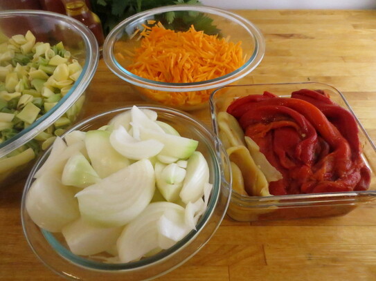 Ceapa tocată şi morcovii se pun într-o cratiţă împreună cu uleiul şi se amestecă la foc mediu pentru aproximativ 5 minute.