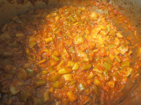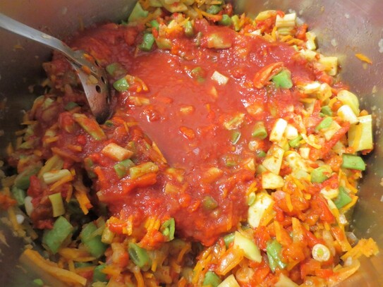 Se fierbe în continuare la foc mic până când compoziţia ajunge la consistenţa dorită, amestecându-se mereu astfel încât pasta de legume să nu se prindă de fundul oalei.
