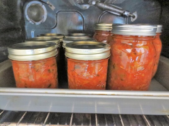 Borcanele spălate, se pun în cuptor la foc mic şi se lasă să se înfierbânte. Zacusca se pune direct în borcanele fierbinţi, care apoi se sterilizează punându-le într-o tavă cu apă fierbinte la cuptor pentru 20-30 minute.