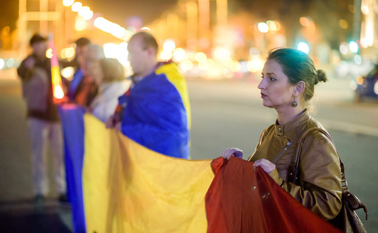Manifestanţii au întins un uriaş steag al Uniunii Europene, luminându-i stelele cu lanterne şi luminile telefoanelor. Acelaşi steag a fost întins de protestatari şi la Bruxelles, în faţa Parlamentului European, iar în zilele ce vin urmează să circule prin ţară în oraşele unde există protestatari #rezist.
