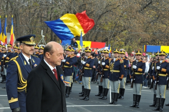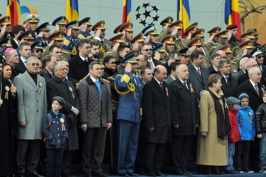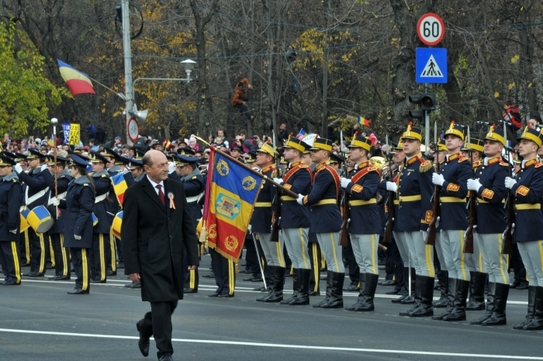 Şeful statului a fost cel care a deschis parada de 1 Decembrie, la ora 11:00, fiind deopotrivă huiduit şi aplaudat de participanţii la ceremonia militară. Traian Băsescu a trecut în revistă Garda de Onoare, iar apoi corul academic ”Divina Armonie” a intonat Imnul Naţional, pe durata căruia au fost trase 21 de salve de tun.